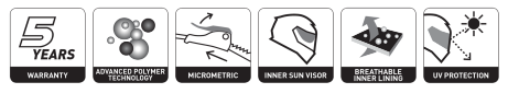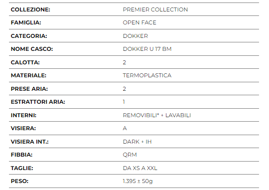 Casco aperto dal look moderno, realizzato in resina termoplastica realizzata con tecnologia avanzata dei polimeri.Si distingue per le prese d'aria superiori, un visierino parasole interno e un ampio schermo con trattamento antigraffio e resistente ai raggi UV. L'imbottitura interna è completamente sfoderabile e lavabile. Chiusura micrometrica.